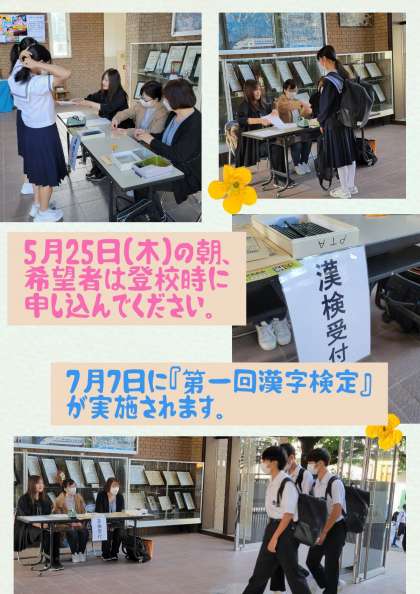 玄関において『第一回漢字検定』の申込みを受付けております。
