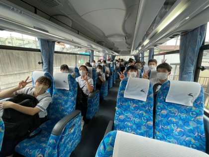 バスの中では、バスレク係の生徒たちが作成したラジオを流して盛りあがっています!