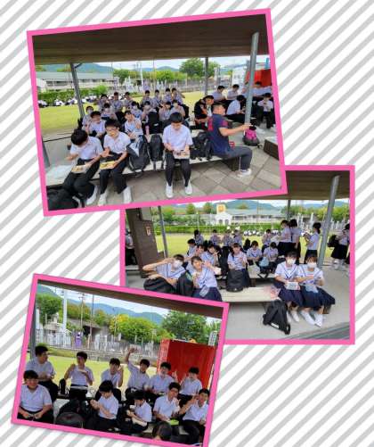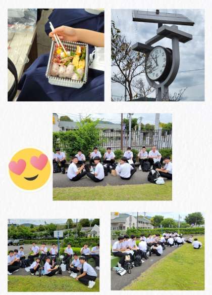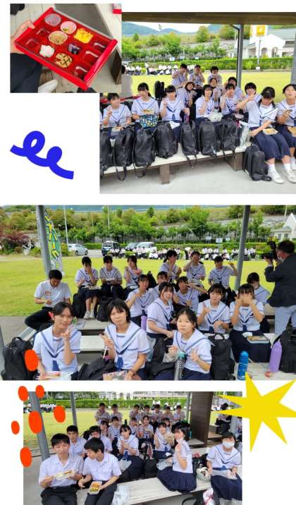 雨の影響は全く受けず屋外芝生広場で昼食タイムです。