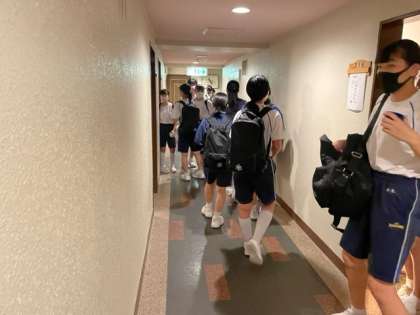 6:30に起床し、朝食へ向かう姿です。