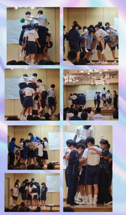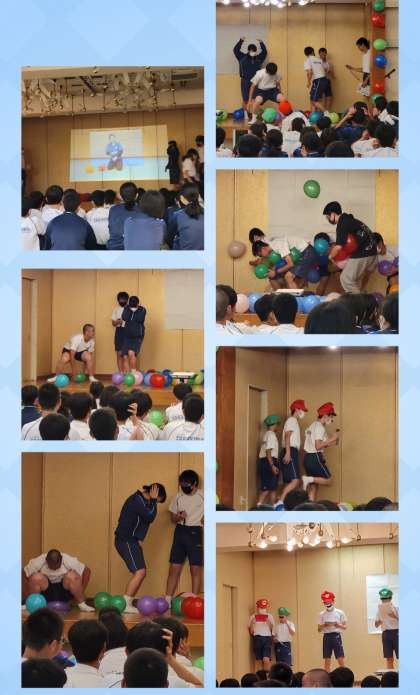 学級対抗風船割り。お尻の圧力が風船にかかれば良いのですが、空振りすれば尾てい骨に激痛です!