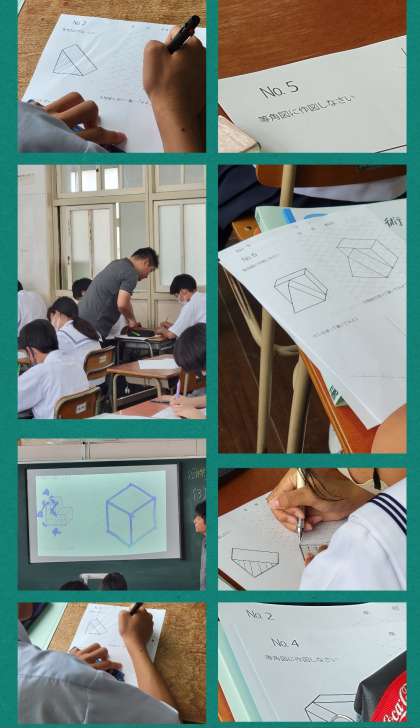 ワークシートと書画カメラで描き方を知り、等角図の練習問題に取りかかります。すると、その面白さにはまり、『面白くて仕方ない』などの言葉出るぐらい夢中になっています。早い生徒から『次の問題ください』と。