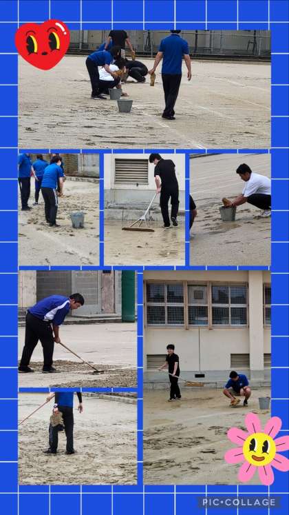 雨はあがっていますが、グランドは水びたし状態です。 今、教職員総出で水抜き、整地に励んでいます。