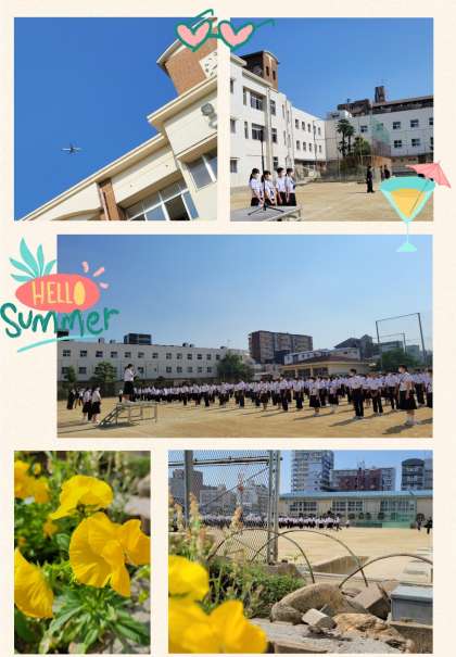 梅雨の合間、快晴のしたで全校集会を行いました。