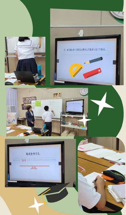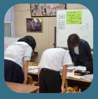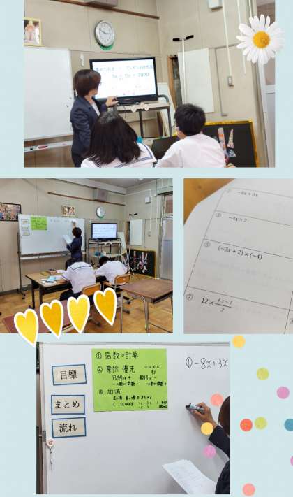 導入、復習問題から取り組みます。誤りを受け入れ、正しい解答方法を学んでいます。「文字式」の表し方のルールと照らし合わせて一つひとつ丁寧に解説する教員。生徒の表情に分かった喜びが表れていました。
