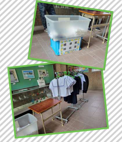 玄関では標準服のリサイクル活動を行っていました。二学期に同様の活動が予定されています。よろしくお願いします。