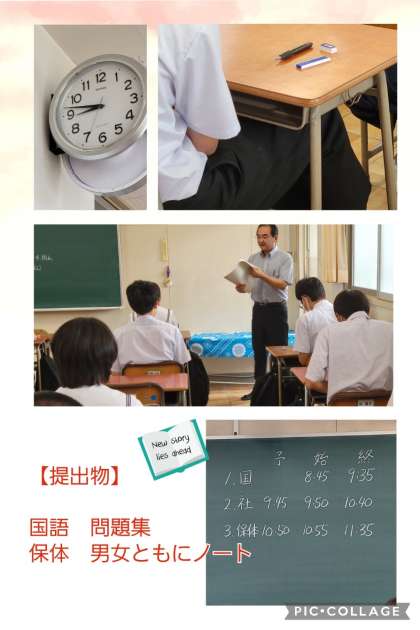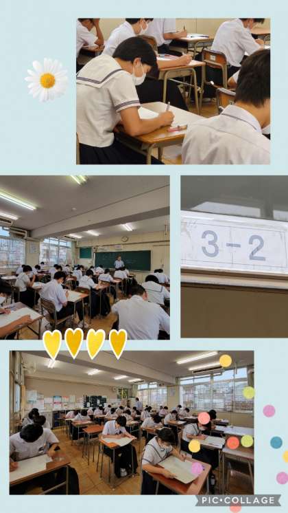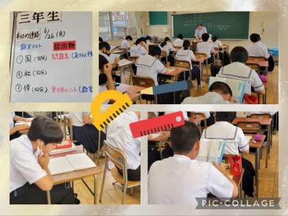 三年生、テスト前の教室では出題範囲について、机上のプリントやノートで繰り返し確認しています。問題が配付される前の短時間ですが、集中しています。