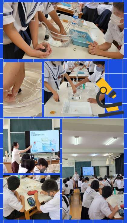 一年生の理科実験では、発生した気体を集める方法を学んでいます。その方法は、「水に溶けるかどうか」から考えます。今回は水に溶けない性質利用して、水上置換法で集めます。