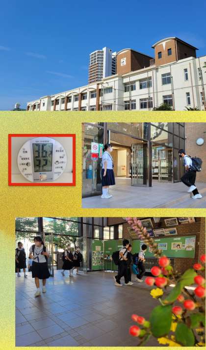 本館一階廊下の気温計が、朝の時間帯に36度を示していました。