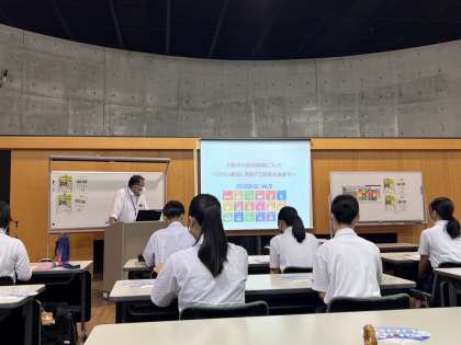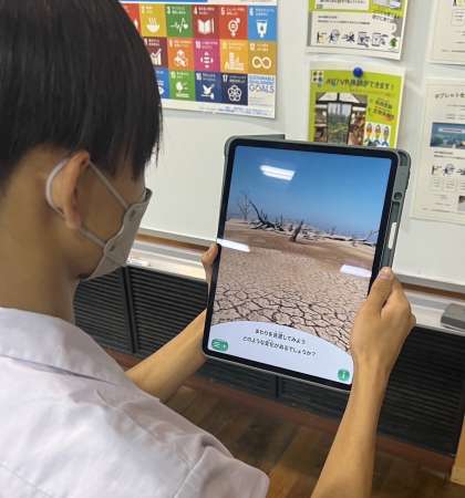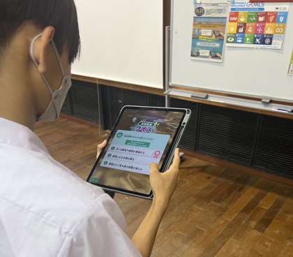 大阪市の環境施策についての講義を受けて、タブレットのARを使って環境問題について学んでいます。