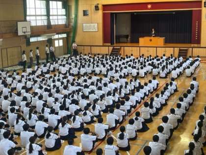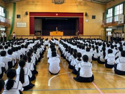 2学期始業式を体育館で行なっています。