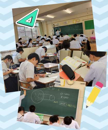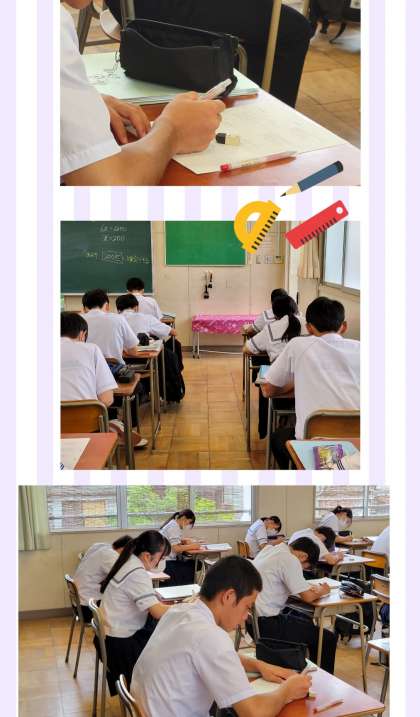 三年生数学 公開日 2023/09/08 更新日 2023/09/08 お知らせ 2組、3組の教室では数学、『二次方程式』と『標本調査』について、学んでいます。 『ax2+bx+c=0』にする。 この形にした上で解の公式を使って計算。 集団の一部分を調査して、集団全体の傾向を推測する標本調査と集団全部について調査することを全数調査。 難しいことにも集中し取り組む三年生です。 いいね(0)
