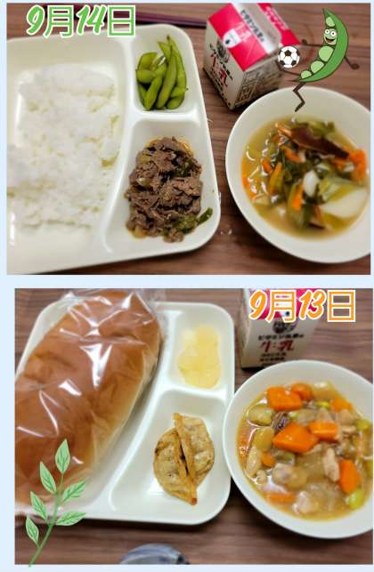 二日間の給食 公開日 2023/09/14 更新日 2023/09/14 お知らせ 9月13日と9月14日の給食です。 比較すると献立内容の違いがよく分かりますね。いつも工夫された栄養満点の給食ありがとうございます。 いいね(0)