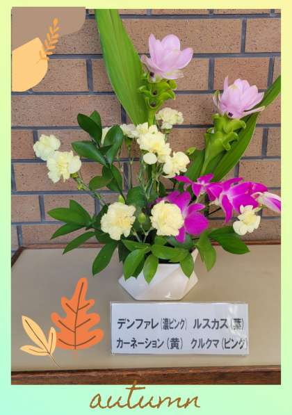 花に見守られ 公開日 2023/10/04 更新日 2023/10/04 お知らせ 10月4日(水) 玄関正面に、『デンファレ』『カーネーション』『クルクマ』『ルスカス』の花を生けていただきました。 朝夕の気温が下がってきたこの時期、彩り豊かな花々が登校する生徒たちを優しく見守っています。 本当に癒されますね。 ありがとうございました。 いいね(0)