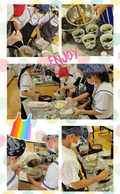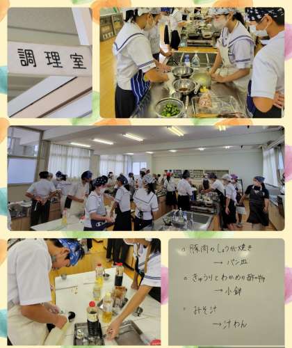 二年生が家庭科授業で調理実習を行っています。今日のメニューは、『しょうが焼き』『キュウリとワカメの酢の物』『みそ汁』です。