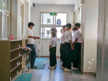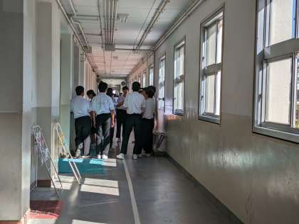 5限め、合唱コンクール自由曲クラス練習の様子です。教室と廊下にわかれ、パート別に練習しています。