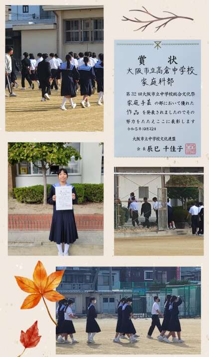 先日、中之島中央公会堂で行われた総合文化祭において、家庭科部が優れた作品を出展されたので、大阪市立中学校文化連盟より表彰されました。