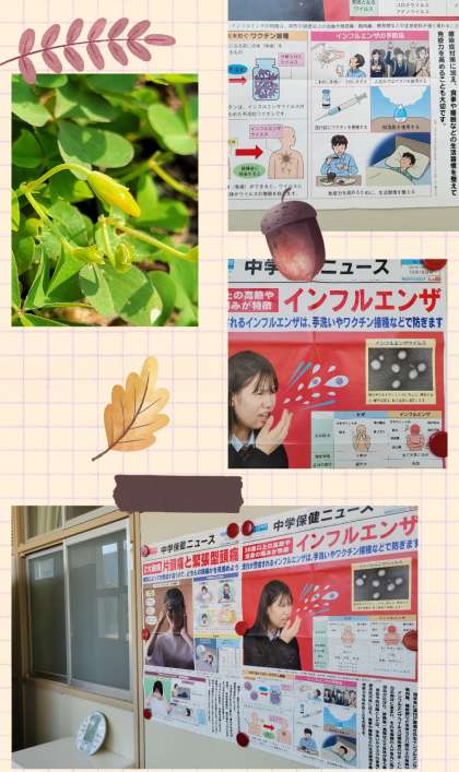 保健室前の掲示板には、『インフルエンザ』についての記事がありました。現在一年生でインフルエンザが流行し学年休業を行っていますが、これから寒くなる季節、さらに感染症には気をつけて行かなければなりません。ぜひ関連記事ご覧ください。