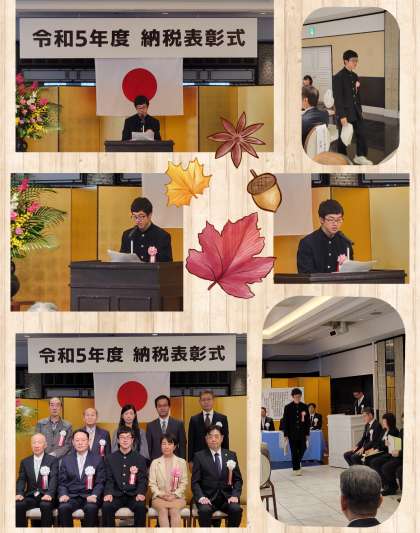 本日、ホテルモントレにおいて開催された令和5年度納税表彰式において、優秀作品者として朗読依頼があり、タイトル『税金とゴミの関わり合いについて』を披露されました。