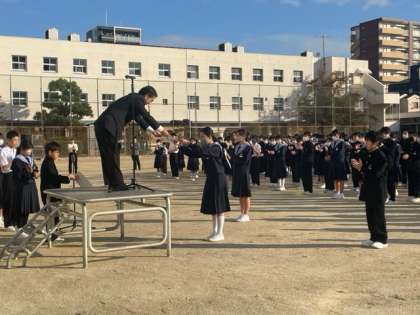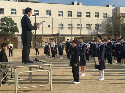 月曜日、朝の全校集会です。 体育大会、学級旗の表彰がありました。