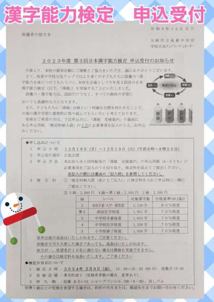 学校元気アップコーディネーターから、『第三回日本漢字能力検定』の申込受付のお知らせがありました。
