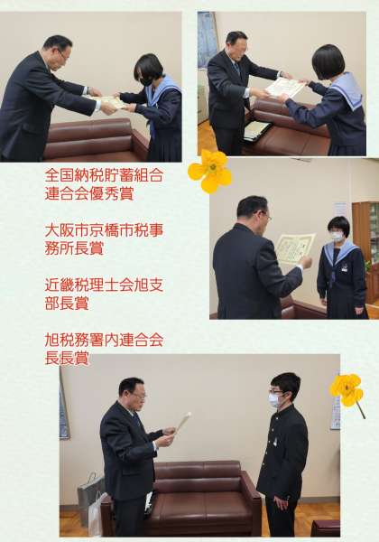 税務署の方々にから、全国納税貯蓄組合連合会優秀賞の生徒を始め、以下の表彰を行いました。