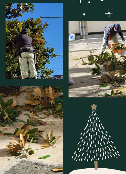 冬休み初日、校内では管理作業員さんによる高木の剪定作業が進められています。