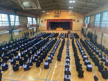 体育館で始業式を行なっております。
