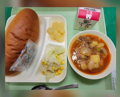 『ビーフシチュー』『カリフラワーとコーンサラダ』 公開日 2024/01/22 更新日 2024/01/22 お知らせ 1月22日(月)、三年生は学年末テストです。この三日間は1.2年生で給食が実施されました。 牛肉いっぱい、じゃがいもに玉ねぎ、にんじんが入った『ビーフシチュー』。具材が大きく、お腹いっぱいになりました。 いいね(0)
