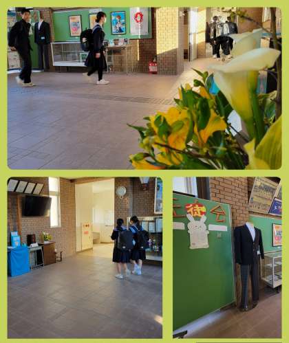 新制服のボタンについて、サンプルを玄関に掲示しました。『金』と『黒』