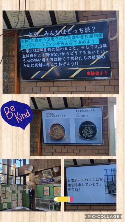 玄関のディスプレイには令和7年度から採用される新制服のボタンについて、案内が表示されました。