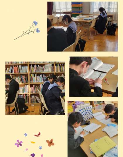 放課後学習会 公開日 2024/02/13 更新日 2024/02/13 お知らせ 本日、2月13日(火)は21日(火)から始まる1.2年生学年末テストの一週間前です。 放課後、学校元気アップによる『放課後学習会』が行なわれています。 多目的室と図書室が開放され、五時までそれぞれが学習に励みます。 自宅での学習は人にもよりますが、いろいろと誘惑が多いですよね。そんなときは限られた時間ですが、学校の静かな環境の中で学習に取り組むのもいいかもしれませんね。ぜひ活用ください。 いいね(0)