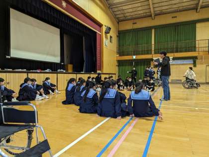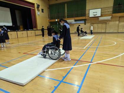 二年生は本日5限めに、障がい理解授業の一環として、車いす、アイマスク等の体験学習を行いました。