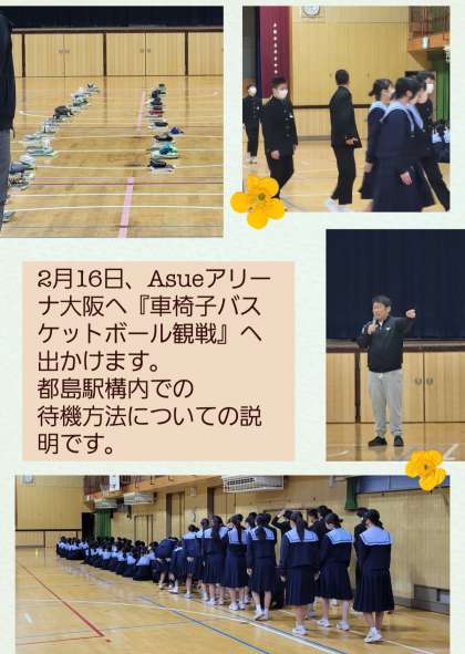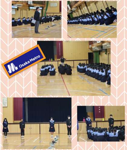 2年生学年集会では、明日の『車いすバスケットボール観戦』に向けての電車移動について指導がありました。