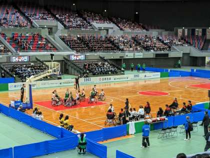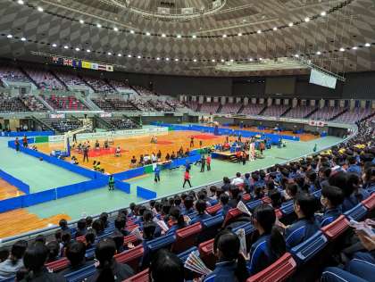 試合開始前から、応援用のハリセンを手に応援の練習があり、会場一体となり、選手をもりあげます。