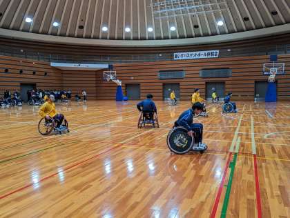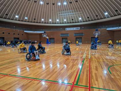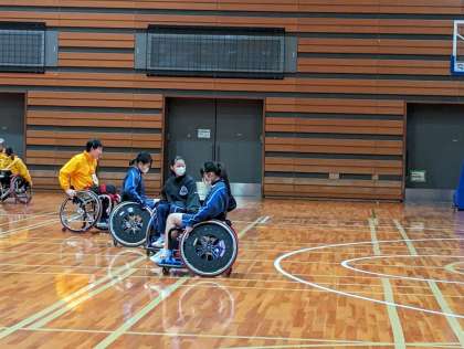 昼食後は、サブアリーナへ移動し、競技用車椅子体験会に参加しています。