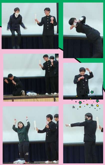舞台上での仲間や先生の動作から連想するものを答えよ!