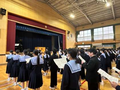 3年生を送る会の練習 公開日 2024/03/06 更新日 2024/03/06 1年 本日の6限は、 2年生と一緒に3年生を送る会の練習を行っています。 感謝の気持ちをしっかりと届けられるように、美しい歌声を響かせましょう! いいね(0)