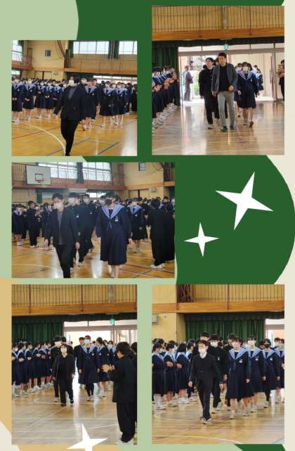 1・2年生が体育館で隊形をとり三年生を迎え入れます。