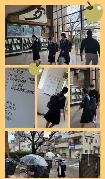 卒業式前日 公開日 2024/03/12 更新日 2024/03/12 お知らせ 3月12日(火) 卒業式前日の登校は雨。卒業する三年生との別れを惜しむ涙雨になっています。 三年生連絡ホワイトボードに目をやる生徒。このホワイトボードも今日で見納めですね。 明日、門出の日の天気は『晴れ』です。 いいね(0)