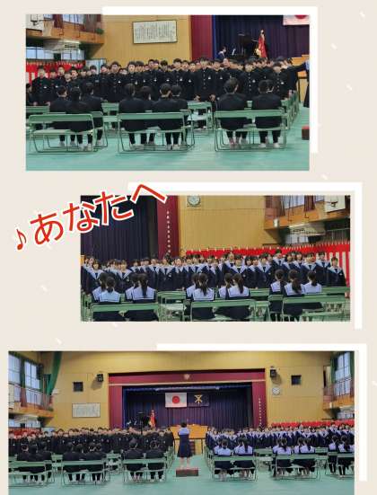 卒業の歌 ♪あなたへ 公開日 2024/03/12 更新日 2024/03/12 お知らせ 予行も終盤、卒業生による卒業の歌♪『あなたへ』が体育館に響き渡ります。 公立高等学校一般選抜試験も終わり、リラックスした中にも、緊張感のある予行でした。 明日は、ここに地域等からも五年ぶりにたくさんのご来賓の方々がご臨席し、花を添えていただきます。 明日、卒業式は9時30分開式です。 いいね(0)