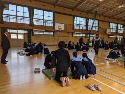 国語係からの、はじめのことば、諸注意をきき、試合開始です。学年教員が交代で詠み人となります。一首ごとに教員が太鼓を鳴らします。体育館内には、音楽教員選曲の雅な音楽が流れる中、熱戦が繰り広げられました。