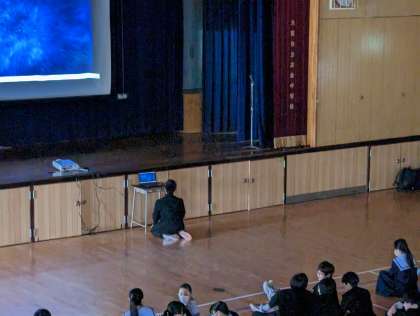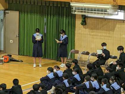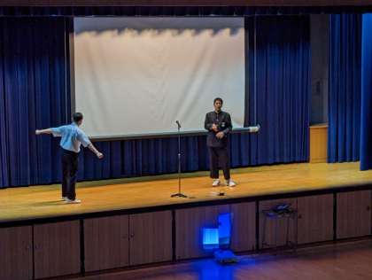 昨日のT1グランプリの様子です。司会進行、映像係の担当生徒が仕事をテキパキとこなし出演準備を整えて、トップバッターの演目は漫才です。