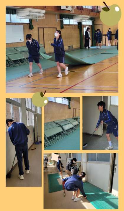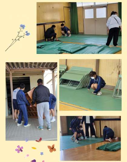 明日の入学式を前に新二・三年生が登校し準備にあたってもらいました。玄関から体育館までの導線、体育館式場の清掃からシート、椅子の配置など手際よく行っています。