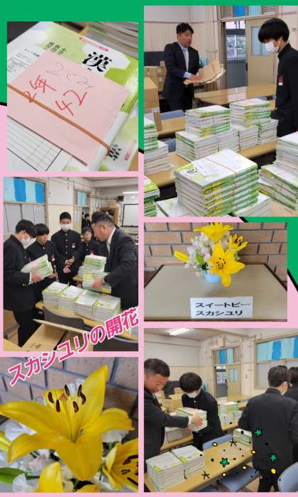 新しい教科書 公開日 2024/04/08 更新日 2024/04/08 お知らせ 各学年、新しい教科書が届けられました。 搬入された新しい教科書を運ぶ生徒たち。 「重っ!」と言いながら教室まで丁寧に運んでいました。 いよいよ新しい教科書で勉強が始まります。 玄関の『スカシユリ』が開花しました。花言葉は『注目を浴びる』。 新年度が始まり、新入生だけでなく高倉中学校生徒が注目されています。 プレッシャーに負けず、みんな頑張れ いいね(0)