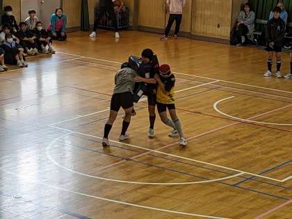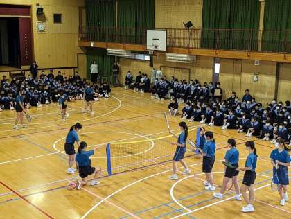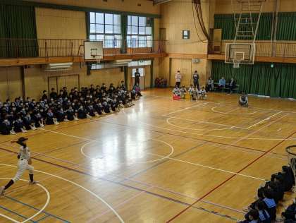 続いて、野球部、ラグビー部、ソフトテニス部の発表の様子です。ピッチング、タックル、サーブなど体育館をうまく使って、各部活動の技を披露してくれました。