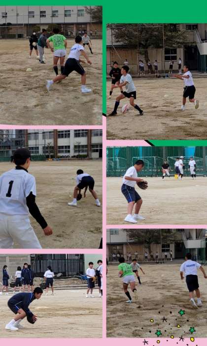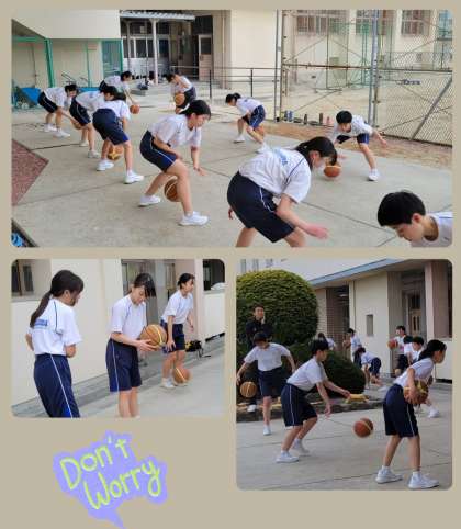 運動場ではソフトテニス、ラグビー、野球部が活動。今日、体育館割り当てのない女子バスケットボール部は校舎前の庭でドリブル練習を行なっていました。