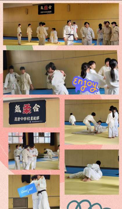 格技室では、柔道部にたくさんの一年生が参加していました。練習用の柔道着を借り先輩から寝技や投げ技などを教えてもらっていました。