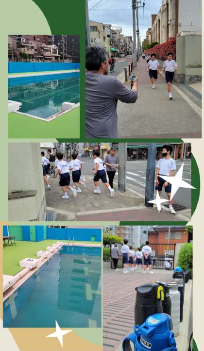 水泳部は水がなくても練習ができます。水筒を持ち校外周をランニングしていました。本日の気温は25度オーバー!入水もそれほど遠くないかも。