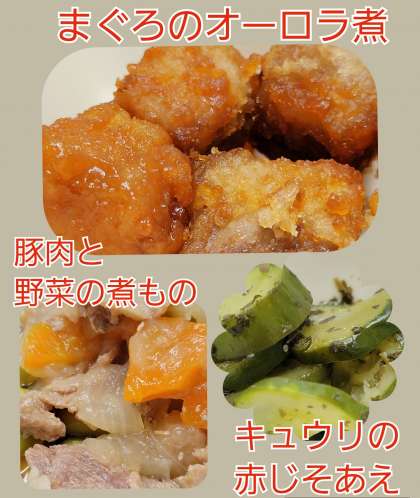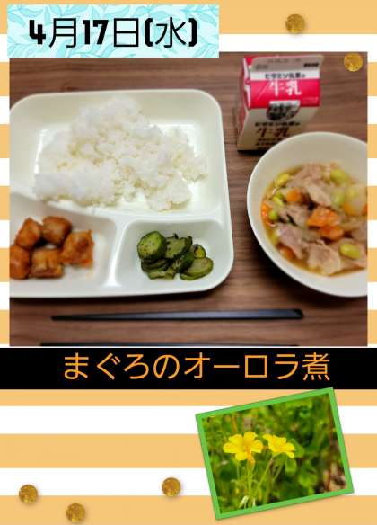 まぐろのオーロラ煮と豚肉と野菜の煮もの 公開日 2024/04/17 更新日 2024/04/17 お知らせ 4月17日(水) 『まぐろのオーロラ煮』は、しょうが汁で下味を付け、ケチャップと砂糖、赤みそを合わせて煮ています。一口サイズで食べやすく、ご飯が進みますね。 『豚肉と野菜の煮もの』は大きくカットされた野菜に、豚肉などが入っています。 魚、野菜、肉がバランスよく入った給食でした。 いいね(0)